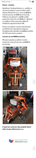 Společnost Tanzberg Mikulov, a.s. pořídila za významné podpory a pomoci Místní akční skupiny Mikulovsko o.p.s. nový zemědělský stroj do provozu zemědělské prvovýroby. Pořízený stroj přispívá k zajištění plnění podmínek moderního zemědělství s důrazem na zlepšení kvality zpracování půdy při dodržování agrotechnických lhůt.